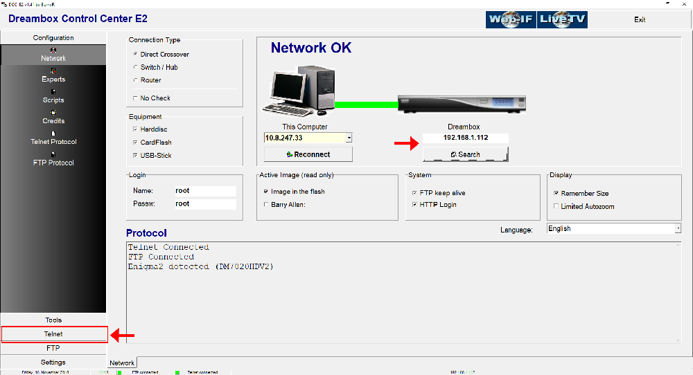 Step 1 : Start by downloading the necessary items. DCC_E2 (Dreambox Control Center for Enigma2) . You must connect to your Enigma box using Dreambox Control Center E2 and click on “ Telenet “. But first, you must find the IP address of your enigma2 box. We will discuss this further ahead in this article.