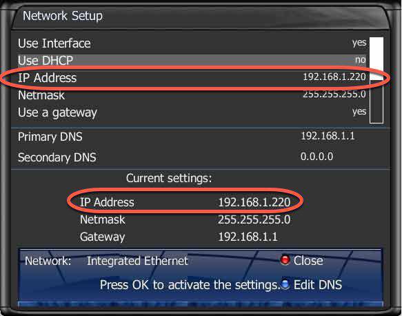 Step 2 : To connect, we need to know the box IP address, username, and password (username and password usually is root/root). Now about the IP, click Menu button on the remote controller. Go to Setting then Network Settings . You should see something like the below image:
