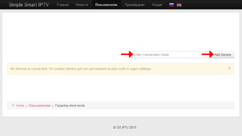 Step 4 : Enter received code at this URL http://ss-iptv.com/users/playlist and press Add Device button.