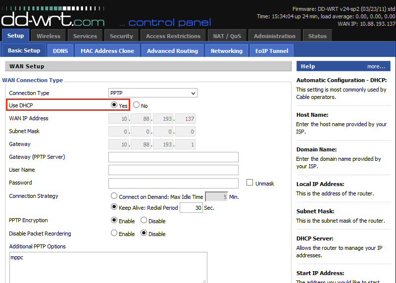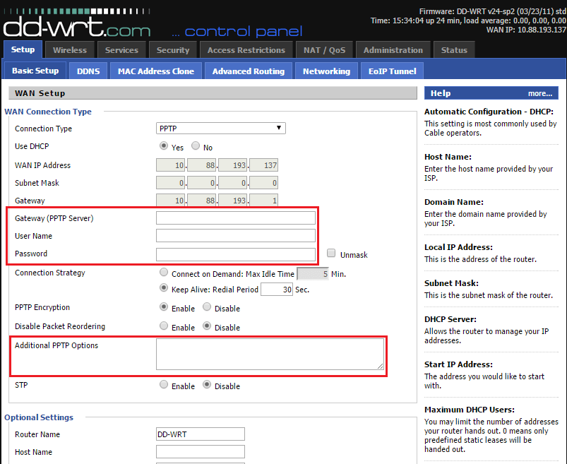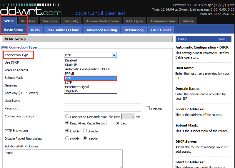 Step 2 : Click on the Basic Setup tab of the DD-WRT router. You can see a window with several entries. From the Connection Type drop-down menu, choose the PPTP.