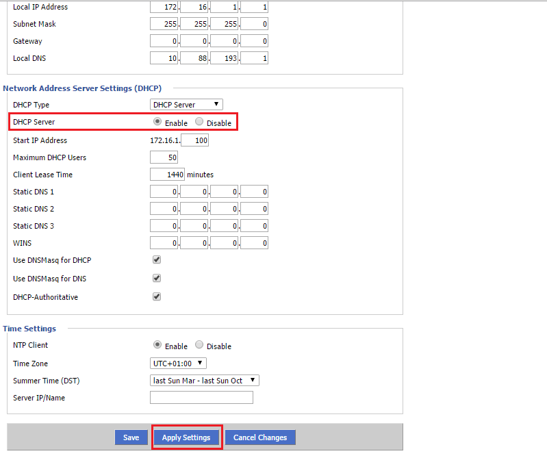 Step 5 : Now you must navigate to DHCP Server and make sure that it is enabled . Click on Apply Settings and then click on Save .