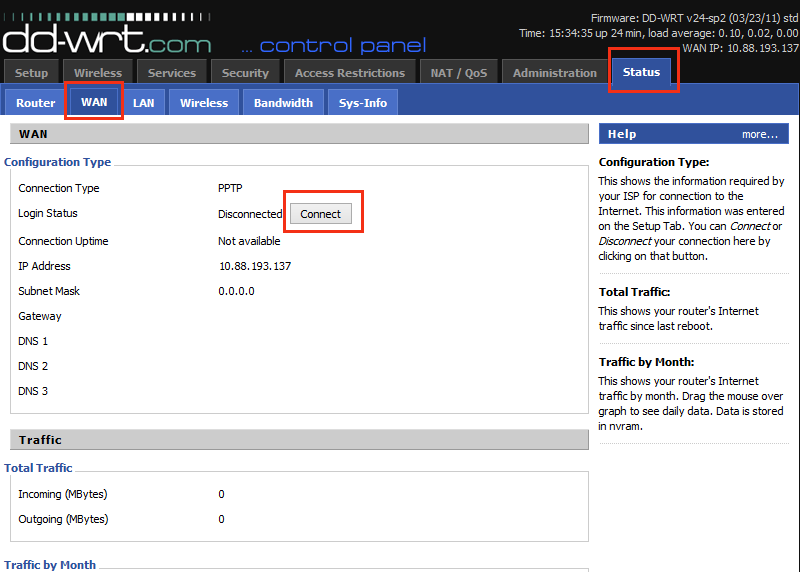 Step 6 : Now you must go to the menu bar and click on Status and then click on the WAN tab. Click Connect in order to connect to your VPN provider.